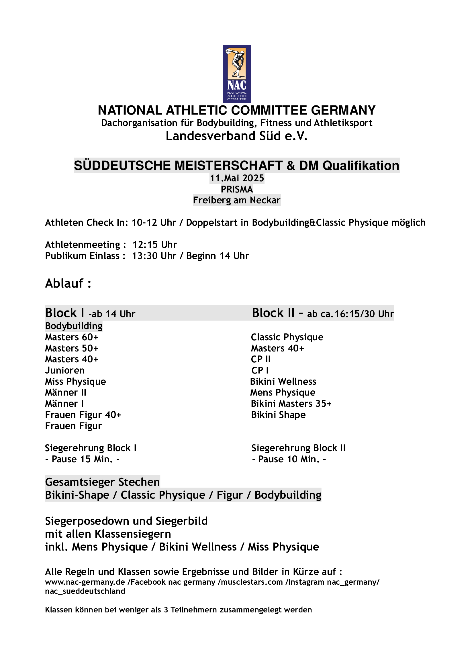 Doppelstart ist innerhalb Männer Classic Physique und Bodybuilding Klassen möglich ! D.h. z.B. Masters, Junioren und Männer im Bodybuilding oder Classic Masters + Classic Physique Manner ! Junioren können bei Einhaltung des Gewichtslimits zudem noch in Classic Physique starten. Quali gilt jedoch nur für die Stammklasse !